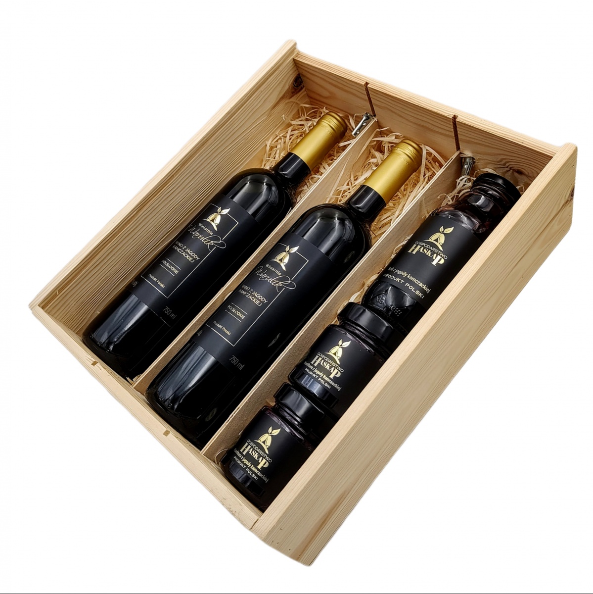 Zestaw: 2 butelki półsłodkiego wina, sok i konfitura z jagody kamczackiej.
